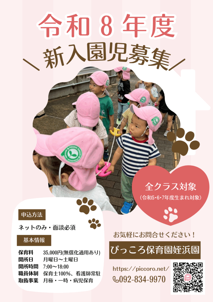 令和8年度 募集開始のお知らせ 2025.10.27 お知らせ 令和8年度4月入園について入園児募集を開始いたします。 受け入れ人数については、状況によって変動しますので公開しておりません。 園内見学については、第4土曜日キッズクラブ開催日のみご案内しております。 PREV NEXT