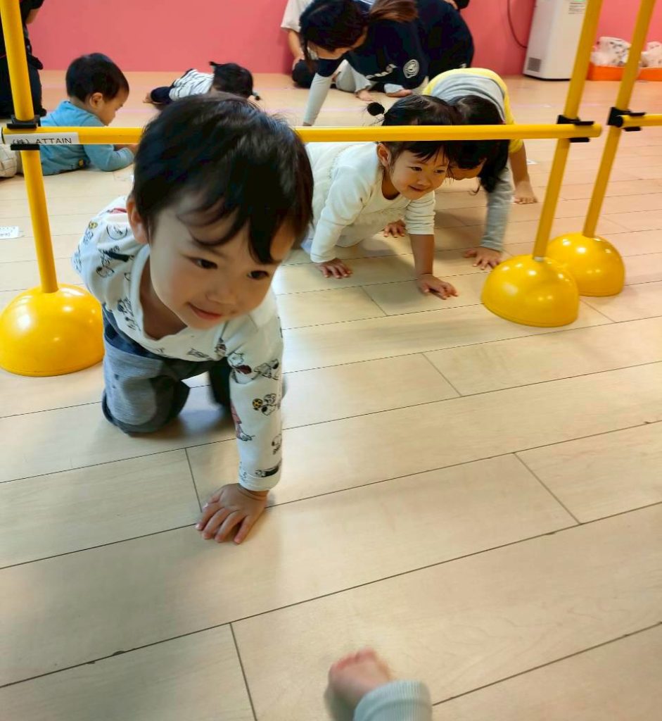 トンネルを、動物のマネをしながらくぐっています!