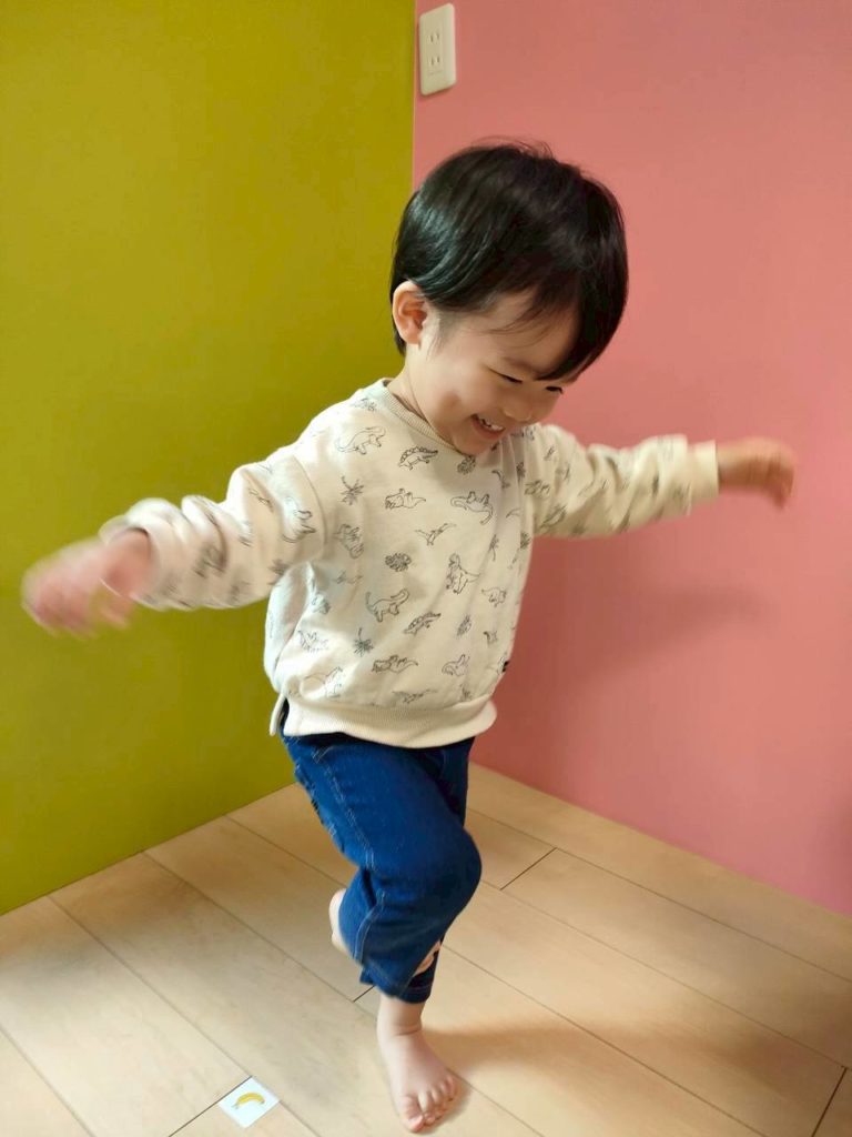 フラミンゴさんのマネをしています!どんどんワニさんやクマさんなどの動きがスムーズになり、バランス感覚も