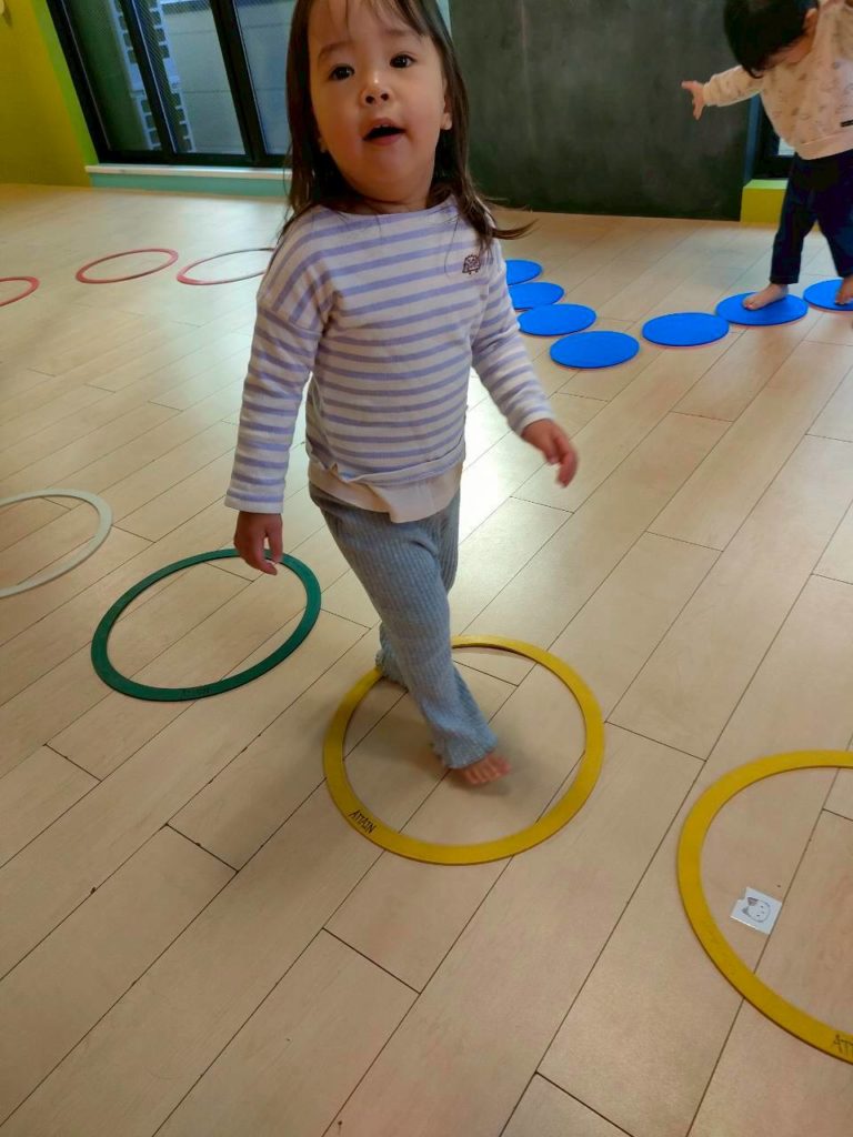 少し曲がっていく道をバランスを取りながら歩いてから、リングにむかってたくさんジャンプしています!
