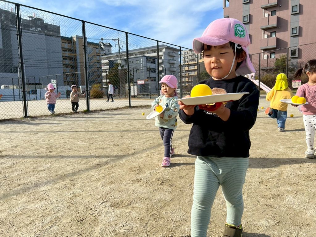 ふるたち先生が投げたボールを打ち返し散らばったボールを、お皿に乗せ落ちないようにバランスを取りながら集めてもらいました!一気に5個も運んでくるお友だちもいました!すごい!