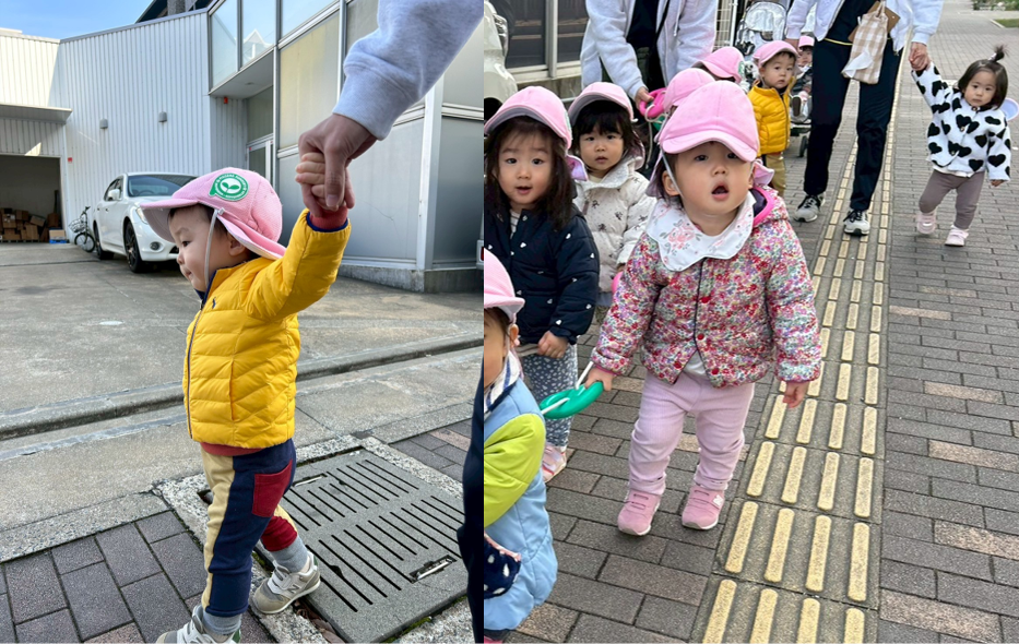 先生と手を繋いだり、誘導ロープを上手に持ってお友達とお話してお散歩するのが楽しくて、お外に行く準備をすると、「いこ!」と扉の前で先生たちの手を引くお友達です!
